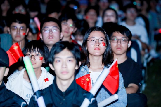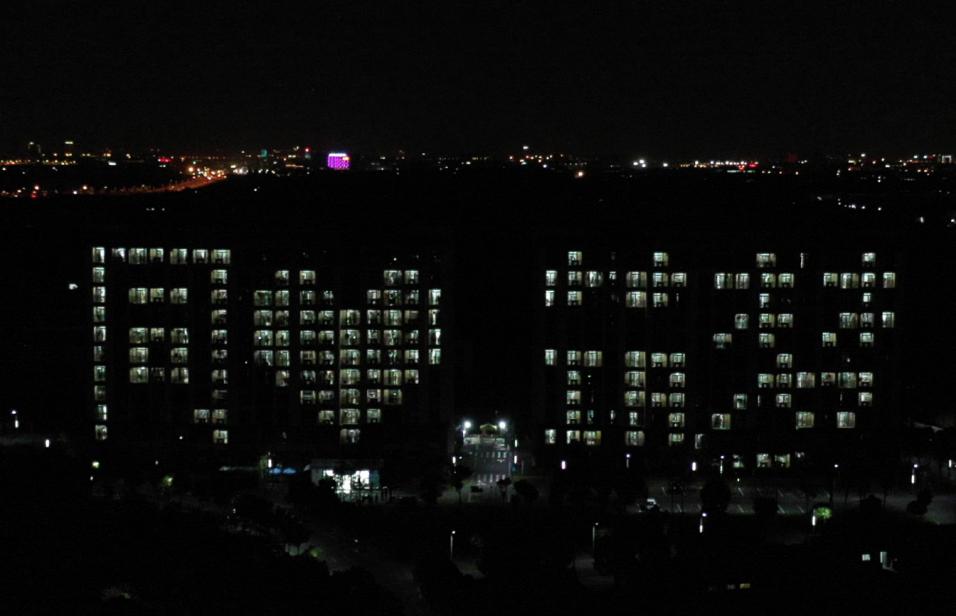 晚会的最高潮出现在“青春告白祖国”环节。28、29号学生宿舍楼的1530名同学,用寝室灯光先后拼成“中国有我”“同❤筑梦”字样,向祖国母亲献上生日祝福。当直播信号出现在晚会现场时,全场一片欢腾。