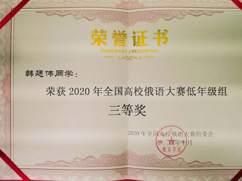 10月24-25日,由教育部主办、黑龙江大学承办的“2020年全国高校俄语专业大赛”的复赛和决赛在哈尔滨如期举行。我校语言文化学院俄语专业2019级韩廷伟同学斩获三等奖,获得国家留学基金委全额资助,将于明年赴俄罗斯高校留学一年。