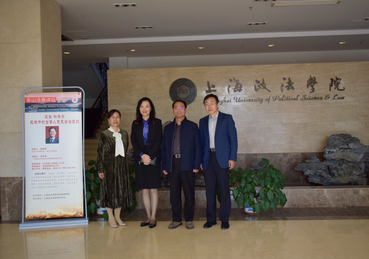 11月4日下午,我校“佘山法商讲坛”第一讲通过线下线上相结合的方式举行。中央马克思主义研究和建设工程(国际私法学)首席专家、中国国际私法学会副会长、中国行为法学会常务理事、吉林大学教授吕岩峰为我校师生作题为“适当-和谐论视域中的当事人意思自治原则”精彩演讲。