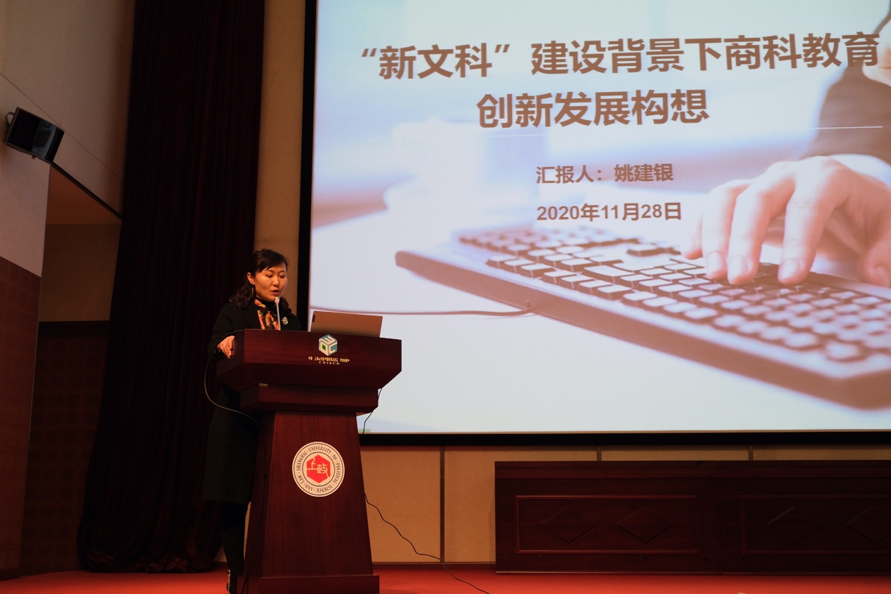 姚建银以本校商科教育的现状与问题为开端,重点阐述了商科教育创新发展的总体设想。姚建银认为,商科教育创新发展的改革方略有以下三个方面:“三个结合”引领商科教育转型升级、“开放办学”深化学科建设综合改革、“六位一体”助推“新商科”内涵提升。她强调商科教育的转型升级与内涵建设,是拟实现通识教育与个性发展相结合、课内知识与课外实践相结合、理论传授与价值引导相结合。