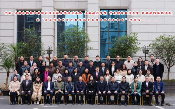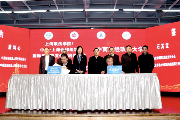 栾永玉、刘晓红以及中南财经政法大学原校长吴汉东,党委常委、副校长闫平,上海政法学院原副校长闫立,湖北省法学会党组成员、秘书长王龙和线上线下的与会嘉宾共同见证签约仪式。我校发展规划处处长、中国-上合基地办公室战略规划部主任石其宝,中南财经政法大学社科院院长、反恐怖主义研究中心主任康均心代表双方单位签约。