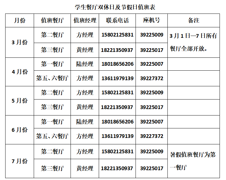 根据学校后勤保障工作安排,现将2021年春季学生餐厅双休日及节假日期间开放值班安排通知如下(备注:如有不确定因素需要调整值班食堂的,以接到综合服务科书面通知为准):