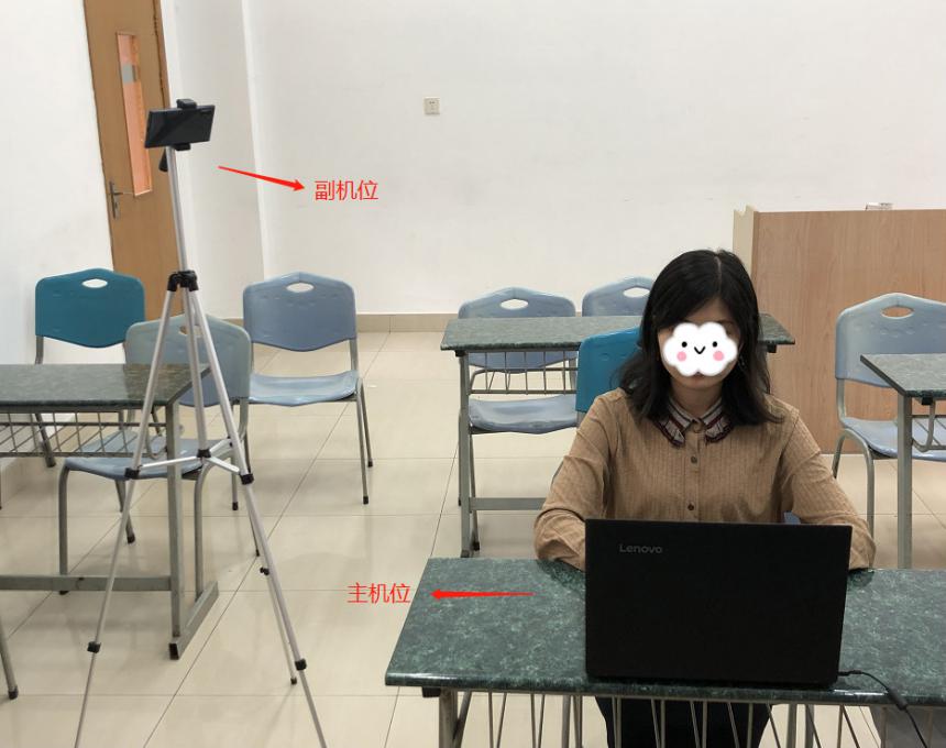 3)【主机位】设备需要正向面对考生,复试全程开启,摄像头正对考生。复试过程中,要求视频中考生界面底端始终不得高于腹部,双手须摆放于桌面上,全程在视频录像范围。【副机位】手机作为远程面试云监考,摄像头需摆放在考生侧后方(与考生后背面成45°角),能够全程拍摄考生本人和电脑屏幕以及桌面周边场景,复试全程开启。主副机位位置、主机位镜头画面和副机位镜头画面应参照下列图示: