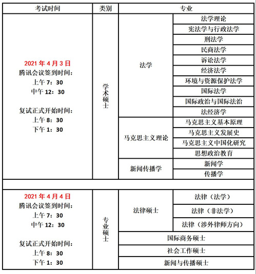 上海政法学院2021年硕士研究生招生复试将于2021年4月3日(学术硕士)、4月4日(专业硕士)进行,请各位复试考生按类别专业于当天上午7点30分、中午12点30分到考务人员通知的腾讯会议平台进行签到。