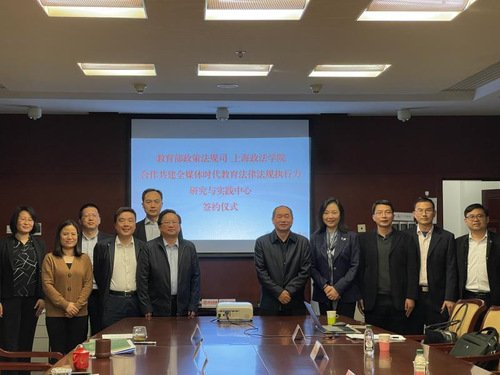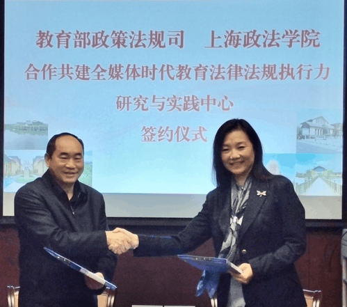 4月6日下午,教育部政策法规司、上海政法学院合作共建全媒体时代教育法律法规执行力研究与实践中心签约仪式在教育部北楼六层大会议室举行。教育部政策法规司司长邓传淮、副司长王大泉,上海政法学院党委书记夏小和、校长刘晓红,以及双方有关处室负责人参加签约仪式。会议由邓传淮司长主持。