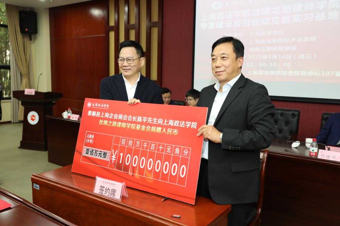 丝绸之路律师学院理事会成立仪式上,聘请陈平为丝绸之路律师学院理事会理事长,并为其颁发理事长聘书。同时,陈平向上海政法学院丝绸之路律师学院基金会捐献人民币壹佰万元,胡戎恩与陈平签订捐赠协议并颁发捐赠证书。