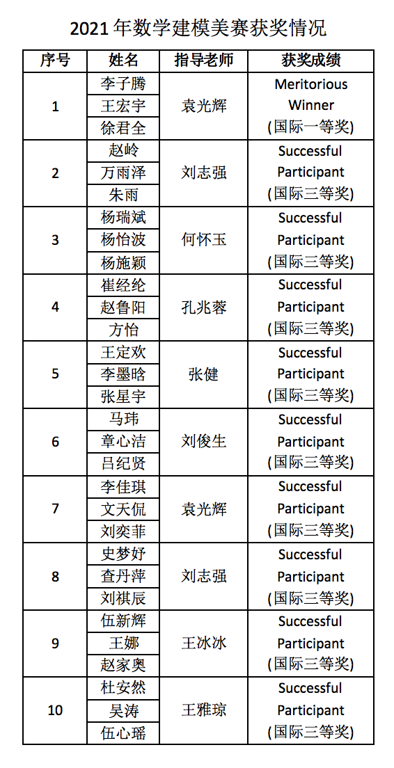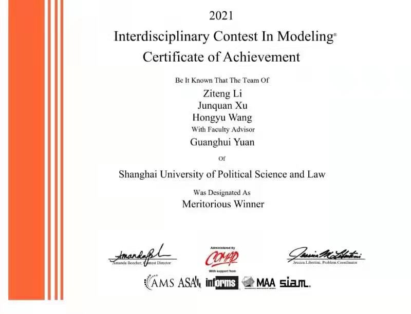 2021年美国(国际)大学生数学建模竞赛(MCM/ICM)成绩日前揭晓,我校经济管理学院继在2020年度赛事中取得一等奖后再创佳绩,斩获了一等奖(Meritorious Winner)1项、三等奖(Successful Participant)9项,创下我校历年来在该赛事中斩获国际奖项数量之最。