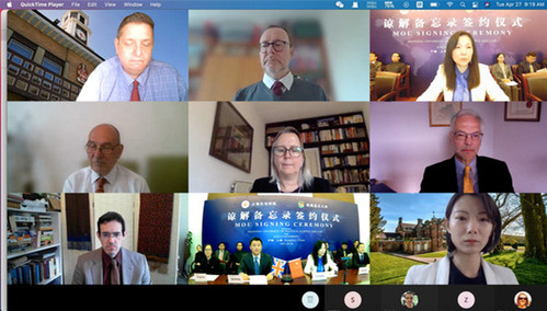 4月26日下午,上海政法学院与英国基尔大学谅解备忘录签约仪式在中国-上合基地国际会议中心举行。上海政法学院校长刘晓红、英国基尔大学校长特雷弗·麦克米伦线上共同签署两校谅解备忘录并分别致辞。签约仪式由我校国际交流处副处长(挂职)张少英、英国基尔大学国际合作学术总监大卫·劳共同主持。