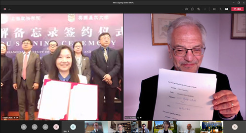 签约仪式在上海设立主会场,在英国设立分会场。我校国际交流处处长、国际交流学院院长欧阳美和,上海纪录片学院理事长戴元光,经济管理学院院长刘志强,政府管理学院副院长谈谭,语言文化学院党总支副书记(主持工作)魏传成,国际交流处副处长张正怡,国际交流学院副院长周怡,中国-上合基地办公室合作部副主任王雅鹃;基尔大学首席运营官马克·培根,社会、政治和全球化研究学院国际化学术带头人索林·巴亚苏,人文社会科学学院国际化总监多米尼克·詹斯,博士研究生学院院长亚历克斯·拉蒙特,人文社科学学院教学总监蒂姆·卢斯蒂格,社会融合研究所所长、人文社会科学学院科研总监德里克·麦基,中国招生负责人赵琦等共同见证了双方的签约仪式。