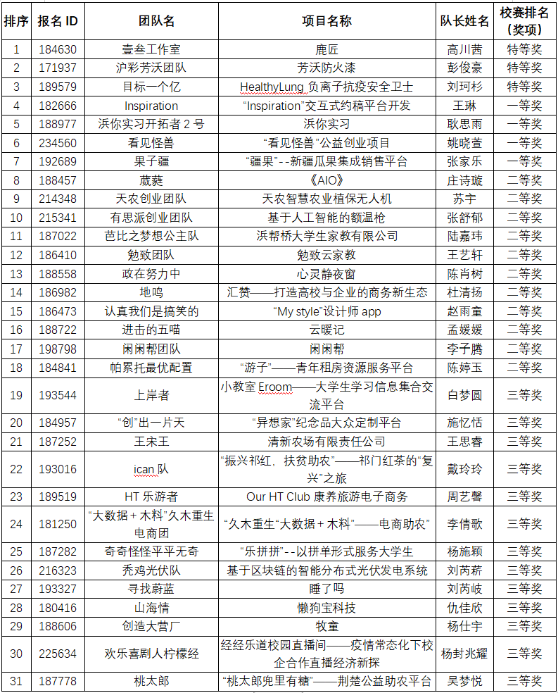 根据团中央和团市委相关通知要求,校团委牵头组织开展了2021年全国大学生电子商务“创新 创意 创业”上海政法学院挑战赛,经过项目申报、资料审核、校外专家评审后,根据校赛相关文件精神,拟评定该31个项目分获校赛特、一、二、三等奖,按照要求,现将作品的相关信息公示如下: