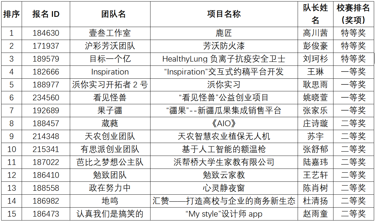 根据团中央和团市委相关通知要求,校团委牵头组织开展了2021年全国大学生电子商务“创新 创意 创业”上海政法学院挑战赛,经过项目申报、资料审核、校外专家评审后,根据校赛相关文件精神,拟评定该31个项目分获校赛特、一、二、三等奖,按照要求,现将作品的相关信息公示如下:
