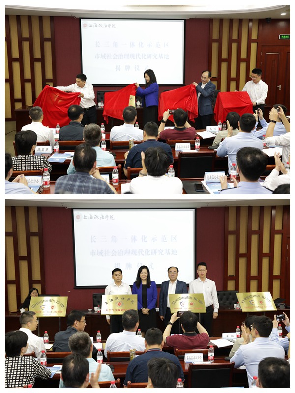 5月26日下午,长三角一体化示范区市域社会治理现代化研究基地揭牌仪式暨研讨会在我校综合研究中心107室举行。上海政法学院校长刘晓红,青浦区区委常委、政法委书记赵明,吴江区区委常委、区公安局局长李文斌,嘉善县县委副书记、政法委书记张锡锋出席并致辞,青浦区、吴江区、嘉善县政法委等单位的领导与工作人员共100余人参加会议。会议由法律学院院长侯怀霞主持。