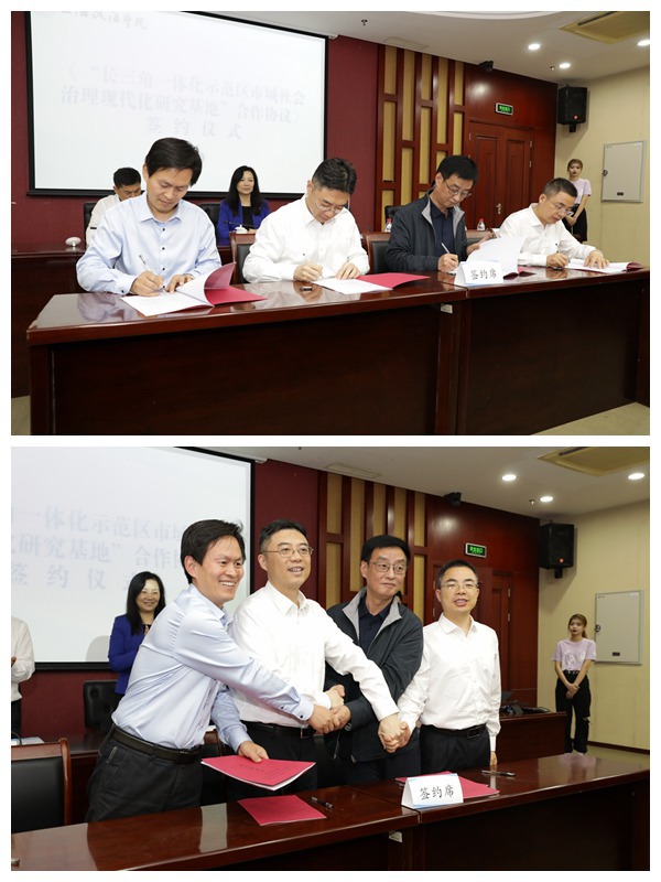 青浦区委政法委副书记曹秋龙,吴江区委政法委副书记沈正华,嘉善县委政法委常务副书记顾红胜与我校法律学院副院长王康共同签订了《“长三角一体化示范区市域社会治理现代化研究基地”合作协议》。