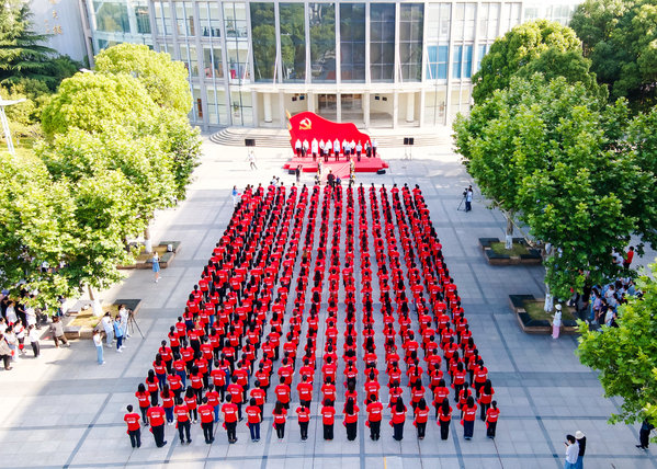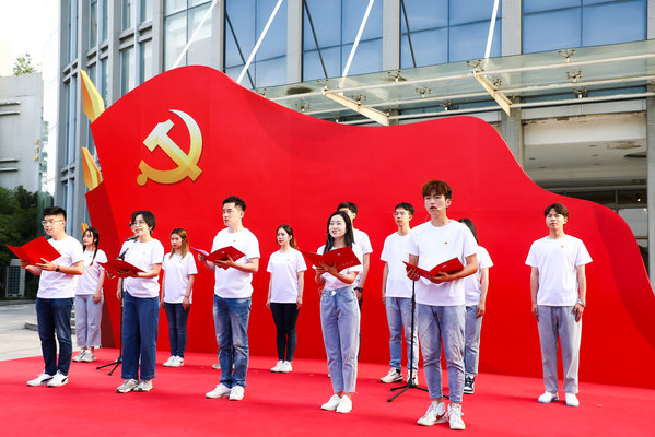 在《不忘初心》的乐曲声中,新党员们由矩形队列迅速变换出“党徽”和“100”的图案,表达“百年接力、强国有我”的壮志豪情,把仪式推向高潮。