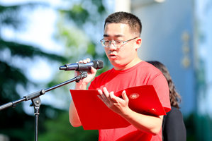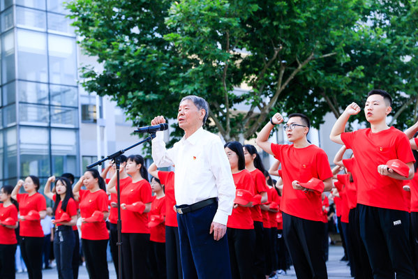 我校86岁的退休党员、“光荣在党50年”纪念章获得者茅家义带领全体新党员宣誓。不变的誓言传承着信仰的力量、青春的梦想。