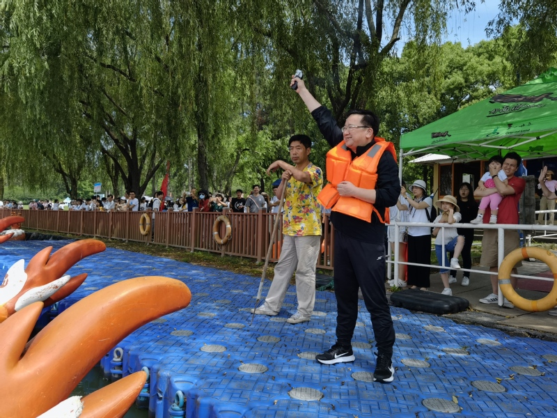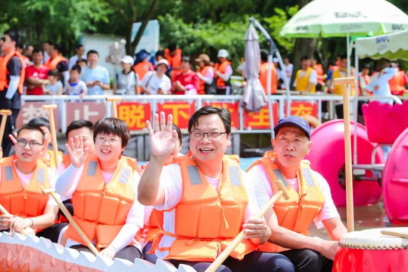 击鼓催征迎百年,奋楫扬帆正当时。夏小和为龙舟赛开赛鸣枪,各支蓄势待发的龙舟队似离弦之箭全速前进,船上的队员踩着铿锵有力的鼓点挥桨竞渡,岸上的啦啦队为自己的队伍摇旗助威、奋力呐喊。