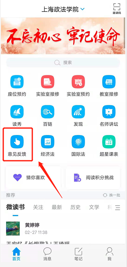 STEP4:进入上海政法学院首页后,点击“意见反馈”进入微应用