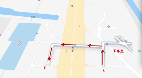 1.9号线佘山站设置临时下车点,距人行天桥上口(A点)约20米。嘉松南路为南北主干道,路口车流量大车速快,请务必通过人行天桥前往地铁站,天桥下口(B点)距地铁站入口约30米。