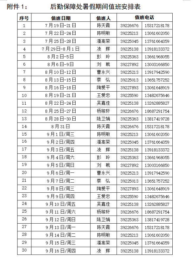 一、校后勤保障处2021年7月19日(周一)—9月16日(周四)安排专人值班,协调学校后勤保障工作。【详见附件一值班表】