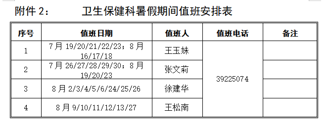 暑假期间,卫生保健科安排值班(7月19日-8月29日)(值班时间:每周一至周五8:30—15:30)【详见附件二】,值班电话:39225074。自8月30日起,开始24小时值班