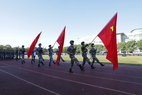 参训学生代表对辛勤付出的教官和老师表示感谢,他们倡议全体同学以这次军训为起点,在今后的学习生活中,提高素养、勤学善思、学以致用,以青春之我、奋斗之我,为祖国发展贡献力量。