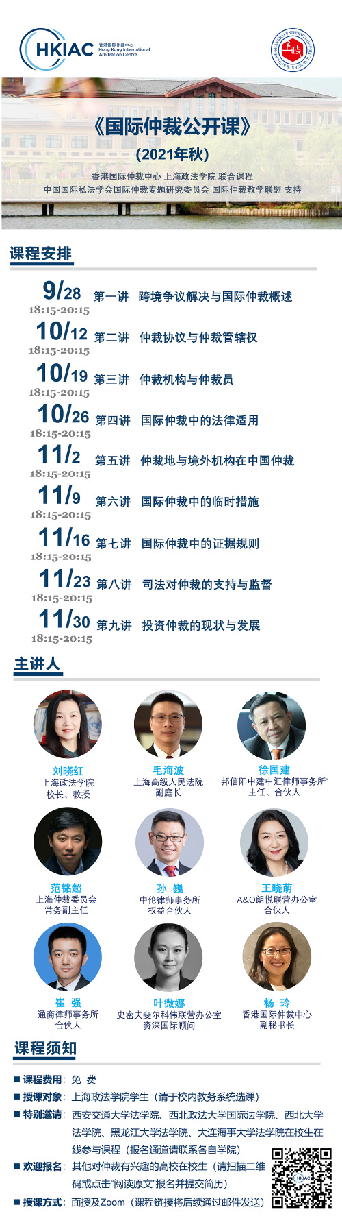 《国际仲裁公开课》由上海政法学院和香港国际仲裁中心共同举办,以线下线上相结合的方式开展高端国际仲裁系列讲座,也是我校针对涉外律师方向研究生和涉外卓越法律人才培养而打造的精品实务课程之一。公开课聚焦国际仲裁在理论和实务中的重要问题和焦点问题,邀请来自实务界的知名专家学者授课,旨在推广、传递国际仲裁的理念和知识,推动学界和实务界对国际仲裁前沿问题的深入研究。《国际仲裁公开课》共计九期,每周都会推出主题讲座,名家汇集,为大家呈现精彩的学术观点碰撞,敬请期待。