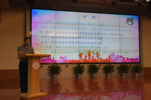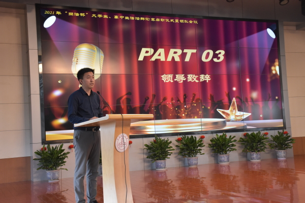 作为东道主的华政附中校长傅松首先致欢迎词。随后,全体成员观看了精心制作的历届法治辩论赛精彩回眸宣传视频《明德尚法 睿智思辨》。会上,陆海佳简要回顾了历届法治辩论赛和法治宣传教育的发展历程并做了全面动员,各主办单位领导苏玉峰、卢天琳、张婷婷依次做赛前动员。苏玉峰指出,本次比赛要发扬法治辩论赛的良好传统,在新的起点上实现新的发展、新的跨越,要紧贴时政热点,做好服务、加强宣传,充分展现青少年的青春风采和责任担当。卢天琳作为法治宣传领域的“老法师”,结合历年法治辩论赛的开展经验,指出法治辩论赛的内容、过程、宣传对于加强青少年法治意识和素养,促进“依法治国”的重要作用,希望本次法治辩论赛在推动青少年法治宣传教育中更上一层楼。张婷婷认为,青少年普法是全民普法的重要对象,希望广大学生从小认同、领略法律价值,从小积极投身到法治建设中,实现从宣传客体到宣传主体、普法对象到普法宣传员的转变,将学法用法遵法守法的氛围推向深入。华政附中蒋怀峰、上海政法学院张军分别公布中学组和大学组的辩题。本次辩论赛的辩题通过全网征集、专家讨论确定,与弘扬法治精神以及结合当下青少年感兴趣的话题和社会热点紧密相关。