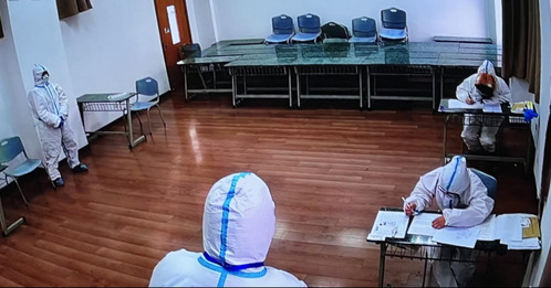 为了保障考务工作顺利开展,学校认真遴选考务工作人员,对70余名考务人员开展多轮三级考务防疫培训,分别对值班保密、监考、视频监考、考务组等进行全面考务流程与技能讲解,确保培训全覆盖,确保熟悉各自岗位职责与工作流程。根据上级加强防疫的新要求,学校立即动员全体符合条件的教职员工积极参与,机关党委号召党员干部发挥模范带头作用,迅速完成了考务人员调整和应急队伍加强工作。相关部门分别进行了保密、安全、突发事件防控、纪律、监考业务等方面的培训,并印发了考务工作手册,细化监考规则和操作程序。考前加大对违规违法行为的宣传警示,考试期间利用信号屏蔽仪、人脸识别仪、金属探测仪等设备,防范高科技作弊、舞弊等违规违法行为,并在12月11日,组织近200名志愿者、全体考务与保障人员开展了组考防疫全仿真流程演练,较好检验了组考防疫方案的可行性与相关预案处理的可靠性。