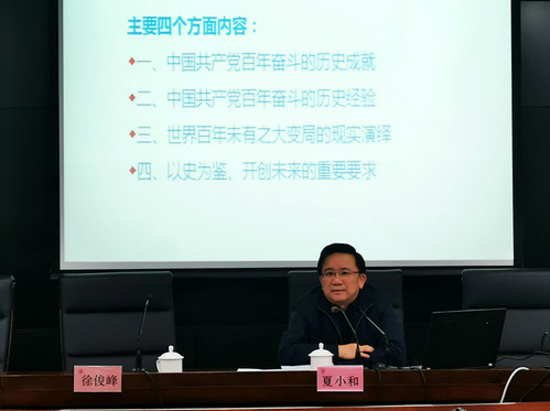 12月28日晚,校党委书记夏小和教授在求实楼513会议室作“勿忘昨天的苦难辉煌,无愧今天的使命担当——党的十九届六中全会精神学习”专题讲座。此次讲座是《习近平新时代中国特色社会主义思想概论》课程开设的专家系列的收官之作。讲座由马克思主义学院党总支书记徐俊峰主持,主修本课的2021级思想政治教育、政治学与行政学、国际政治等专业的百余名本科生现场聆听。
