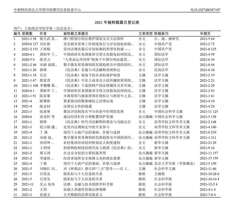 近日,根据中南财经政法大学图书馆期刊信息检索中心《检索报告》显示,《上海政法学院学报(法治论丛)》刊文被2021年《新华文摘》《高等学校文科学术文摘》《中国社会科学文摘》和人大复印报刊资料等权威二次文献转载、摘编31篇次。其中人大复印报刊资料14篇,《高等学校文科学术文摘》4篇,《新华文摘》4篇,《中国社会科学文摘》2篇,《社会科学文摘》1篇,《北京大学学报(学报概览)》1篇,《社会科学报》4篇,《文摘报》1篇。该转载、摘编篇次为历年来最多。