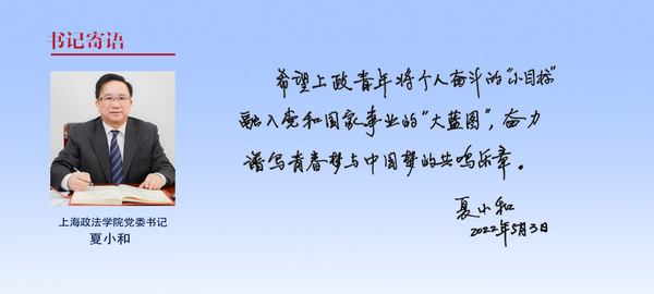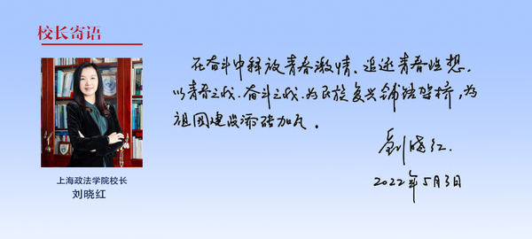 在五四青年节到来之际,校党委书记夏小和教授、校长刘晓红教授向全校青年师生致以节日的祝贺,向奋战在抗疫一线的青年师生表示衷心感谢和亲切问候,寄语广大上政青年牢记使命,不负韶华,坚定理想信念,为实现中华民族伟大复兴的中国梦贡献青春力量!
