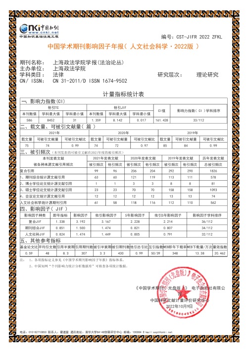 近日,中国知网发布了《中国学术期刊影响因子年报(人文社会科学2022版)》。数据显示,《上海政法学院学报(法治论丛)》“复合影响因子”从2021年的2.428上升到2022年的3.192;综合影响因子从2021年的1.048上升到2022年的1.500;“影响力指数(CI)”学科排序也从2021年第41位上升到2022年第33位。三项指标进步明显。