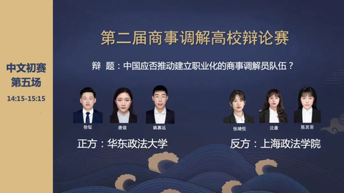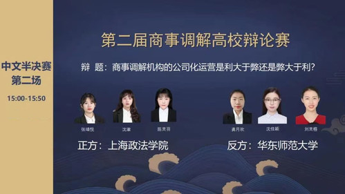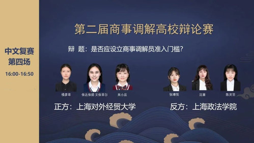 作为“上海法治文化宣传月”的重要活动和“东方法学商事调解大赛”赛事之一,第二届商事调解高校辩论赛于11月6日开赛,分为初赛、复赛、半决赛与决赛四个阶段,云集了复旦大学、上海交通大学、同济大学、华东师范大学、华东政法大学、上海财经大学、上海政法学院、上海海事大学、上海对外经贸大学、上海大学、华东理工大学、上海师范大学、上海外国语大学、东华大学等14所沪上知名高校的20支队伍参赛。比赛全程通过哔哩哔哩等平台直播。