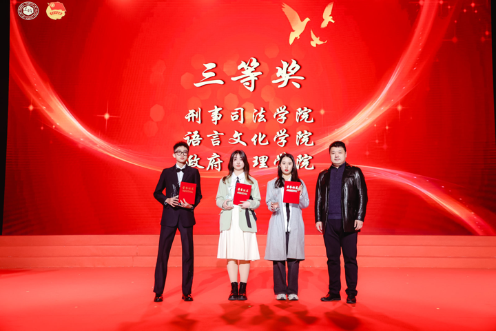 经过激烈的角逐,法律学院代表队荣获本次歌会一等奖,经济管理学院、经济法学院代表队获得二等奖,刑事司法学院、语言文化学院、政府管理学院代表队获得三等奖,警务学院、国际法学院、人工智能法学院、纪录片学院、马克思主义学院代表队获得优胜奖,经济法学院、法律学院获得最佳指挥奖,刑事司法学院、法律学院获得最佳伴奏奖。