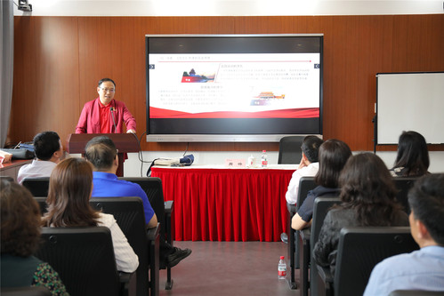 随后,我校学习组一行来到复旦大学望道研究院,聆听复旦大学机关党委常务副书记、望道研究院副秘书长周晔讲授的“青春宣言 追望大道”专题党课。他结合党的二十大精神和习近平总书记主题教育期间重要讲话精神以及《望道》拍摄细节等,从“寻道、信道、传道、弘道”四个方面,为大家带来了一堂生动鲜活的现场党课。