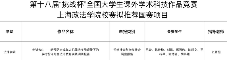 根据国赛申报工作安排,拟推荐项目《走进大山——新预防未成年人犯罪法实施背景下乡村留守儿童法治教育实践调研报告》代表上海政法学院参加第十八届“挑战杯”全国大学生课外学术科技作品竞赛,根据评选工作有关程序,名单公示如下: