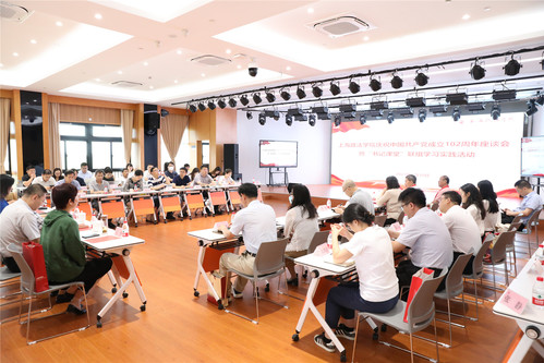 为庆祝中国共产党成立102周年,扎实推进学习贯彻习近平新时代中国特色社会主义思想主题教育向纵深发展,6月30日上午,上海政法学院党委在成德楼四楼多功能厅举行庆祝中国共产党成立102周年座谈会暨“书记课堂”联组学习实践活动。校党委书记、主题教育领导小组组长葛卫华,校党委副书记、校长刘晓红,校党委副书记、纪委书记、监察专员潘牧天,校党委副书记刘刚出席活动。校党委主题教育领导小组办公室成员,各二级党组织书记(含专职副书记)、专兼职组织员,基层党支部书记、老党员、学生党员代表参加本次活动。