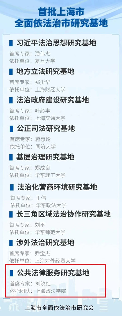 日前,上海市全面依法治市研究会公布首批9个上海市全面依法治市研究基地名单,上海政法学院获批“公共法律服务研究基地”,由校长刘晓红担任首席专家。