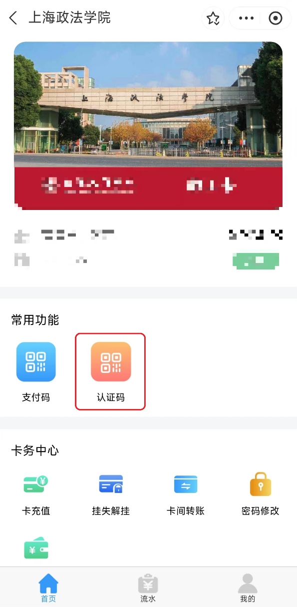方式二:打开支付宝APP中上海政法学院校园一卡通小程序,使用“认证码”(图1)扫描图书馆入口闸机“刷卡/扫码”模块(图2)进馆。