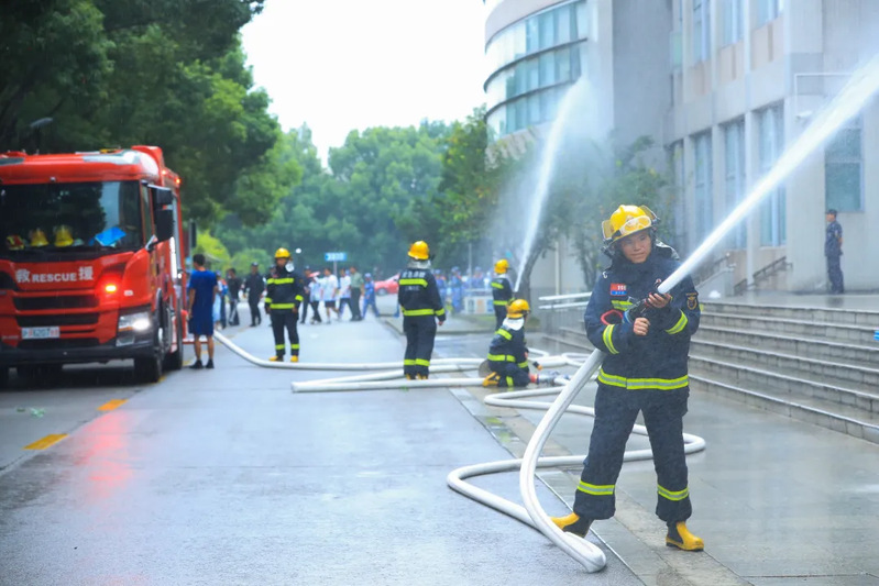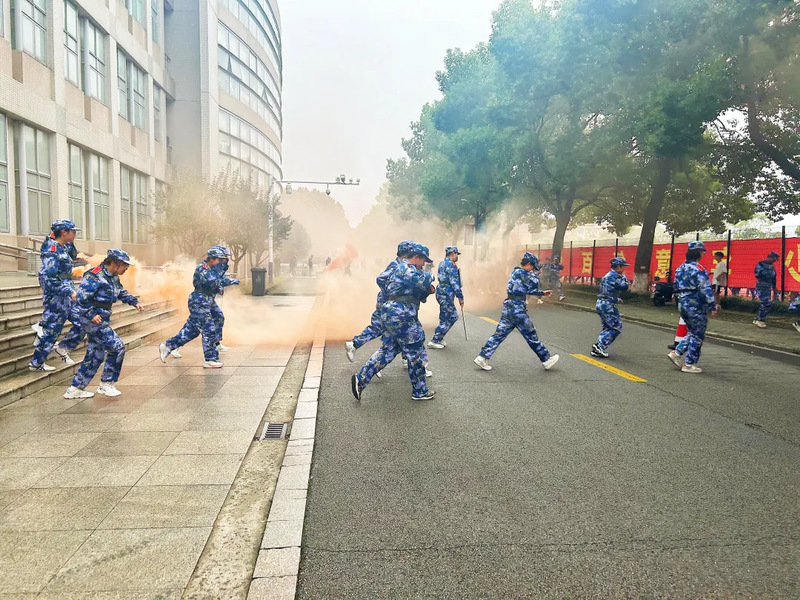 2023年学生军训总结大会前,有序开展了消防应急疏散演练。