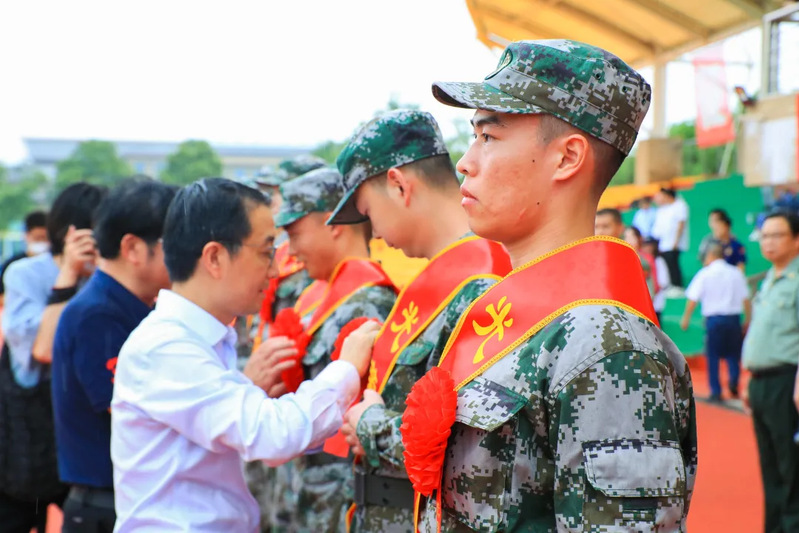 扬帆起航新征程,无悔青春铸军魂。全体应征入伍新兵意气风发、士气高昂。校领导为即将踏上军旅征程、投身强军伟业的新兵们佩戴红花和荣誉绶带,向他们表示热烈的祝贺并衷心祝愿新兵们此程能够不负青春,保卫家国,展现上政学子的非凡风采。
