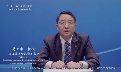 我校党委书记葛卫华线上出席研讨会并致辞。葛卫华代表上海政法学院和中国-上海合作组织国际司法交流合作培训基地(简称“中国-上合司法培训基地”),表达了同“一带一路”沿线国家积极开展合作交流,聚力共建“一带一路”教育、法律共同体的美好愿景,并预祝本次研讨会取得圆满成功。