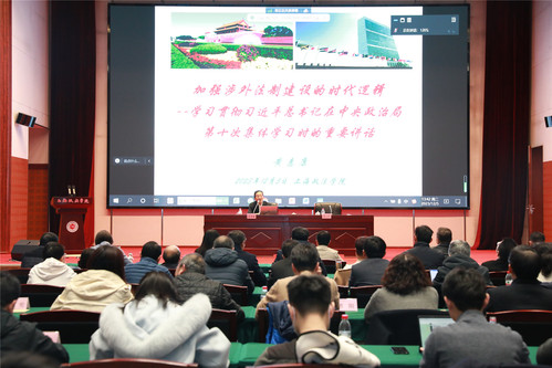 近日,中共中央政治局就加强涉外法制建设进行第十次集体学习,习近平总书记强调要加强涉外法制建设,营造有利法治条件和外部环境。武汉大学特聘教授黄惠康同志受邀就此问题进行讲解,并提出工作建议。12月5日下午,我校在中国-上合司法培训基地召开党委中心组(扩大)学习会,特邀联合国国际法委员会委员、武汉大学特聘教授黄惠康作“加强涉外法制建设的时代逻辑”专题辅导报告(名家讲坛第156讲)。校党委书记葛卫华主持会议,校党委副书记、校长刘晓红以及学校党政领导班子,中层干部和师生代表参加学习。