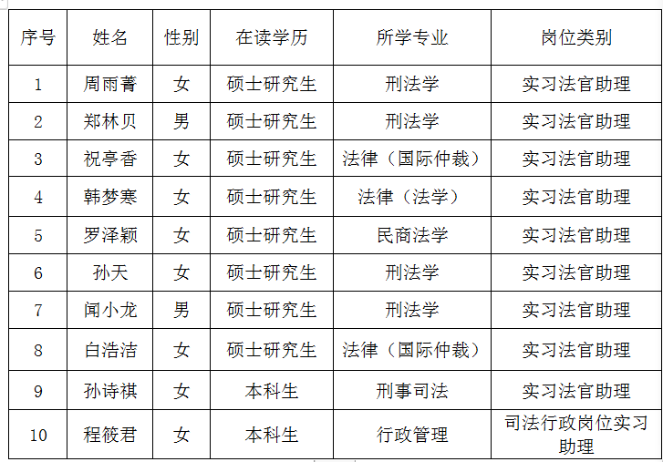 为深化拓展法院与高等院校、科研院所的交流合作,推动法学教育、法学理论研究与司法实务的深度衔接,合力培养新时代高素质法治人才,根据上海政法学院《关于组织开展推荐上海法院第二期实习法官助理项目的通知》要求,研究生处、教务处于2024年5月18日开展了相关工作。经学生个人申报、职能部门面试,最终择优推荐10名学生参与上海法院第二期实习法官助理项目,其中研究生8名,本科生2名。现将具体名单公示如下: