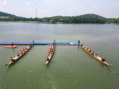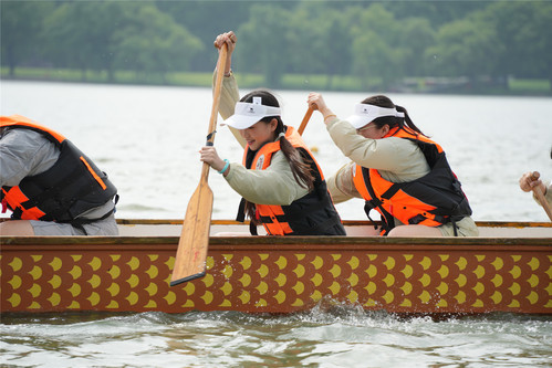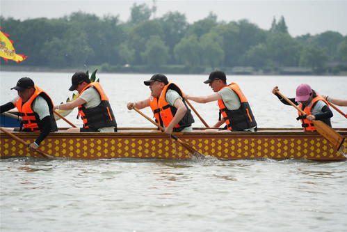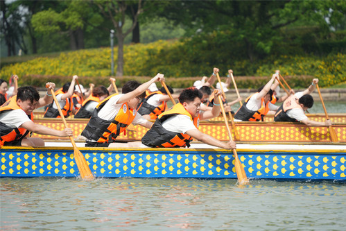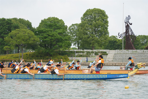 比赛设置4条航道,随着发令枪响,各支龙舟如离弦之箭,在月湖上划出一道道银色的浪痕。鼓手擂鼓助威,桨手齐声呐喊,划桨声与欢呼声交织,岸边观众挥舞旗帜,加油声此起彼伏,将现场气氛推向高潮。参赛队员以整齐划一的动作奋力挥桨,水花飞溅间尽显团结与力量的魅力。经过激烈角逐,上海政法学院附属松江外国语学校代表队凭借出色的表现拔得头筹,上海政法学院附属青浦崧淀中学代表队、语言文化学院(国际交流学院)代表队摘得亚军,体育法学院代表队、机关分工会代表队、警务学院代表队荣获季军。