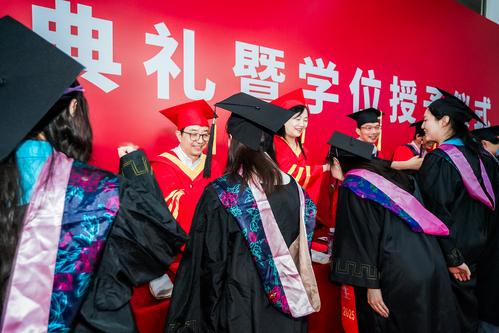 毕业典礼尾声,全体毕业生身着学位服,依次上台接受拨穗并合影留念。道一声谢意,道一声珍重,向更高处看更广阔的天空。