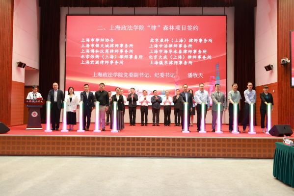 上海市律师协会会长邵万权,北京盈科(上海)律师事务所、上海锦天城律师事务所、上海申浩律师事务所、上海博和汉商律师事务所、上海海华永泰律师事务所、北京炜衡(上海)律师事务所、北京大成(上海)律师事务所、上海市君澜律师事务所、上海市瀛东律师事务所代表与我校党委副书记、纪委书记、监察专员潘牧天共同按下“高质量合作办学”加速键。