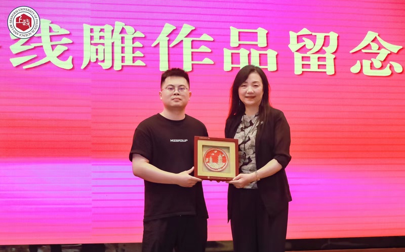 纪念仪式环节,校友代表张志远向母校赠送了具有福建特色的闽南传统工艺瑰宝——线雕,以寄托祈福纳祥的美好愿景。