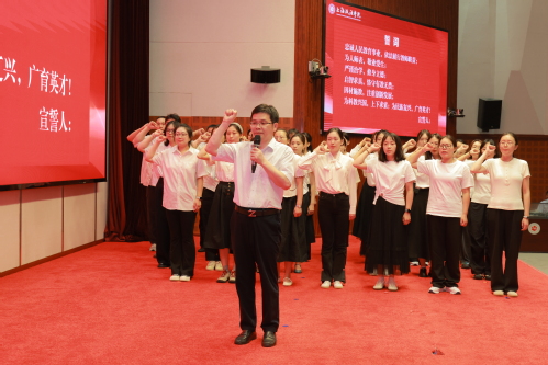 在庄严的宣誓环节,副校长毛军权领誓,上海政法学院及附属学校全体新进教师高举右拳,许下了恪守师德、潜心育人的郑重承诺。铿锵誓言回荡全场,彰显新一代教育者躬耕教坛、强国有我的初心与信念。
