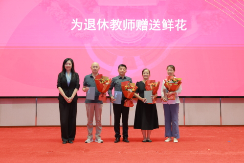 在全场热烈的掌声中,退休教师代表李起、马小娜结合几十载从教经历,深情回顾教育生涯,生动诠释对教育家精神的理解与坚守,分享“铸魂”路上的点滴感悟。刘晓红校长向退休教师献上鲜花,表达崇高的敬意与祝福。